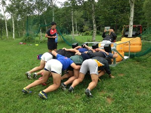 『4年の田中です。私は青山学院でラグビーを14年間続けてきました。大学のラグビー部は高等部までと違い、全国から強豪選手達が集まり、同じポジションでのライバルが多く常に努力が必要な環境です。同時に密度の濃い練習の中で、日々いろいろな技術や考え方を吸収できる環境です。大学のラグビー部に入らなければ出来ないラグビーを今出来ていると感じでいて、とても充実しています。合宿も残りわずかです。少しでも多く試合に出て大学で学んだ考え方や技術で少しでも勝利に貢献したいと思っています。』