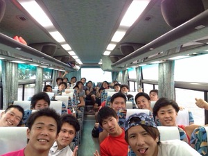 (写真:バスでゴルフ場に向かいます。まだまだ元気です!)