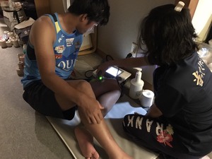 超音波や鍼などの器具や学生トレーナーによるマッサージで部員たちは疲れや患部を癒します。
