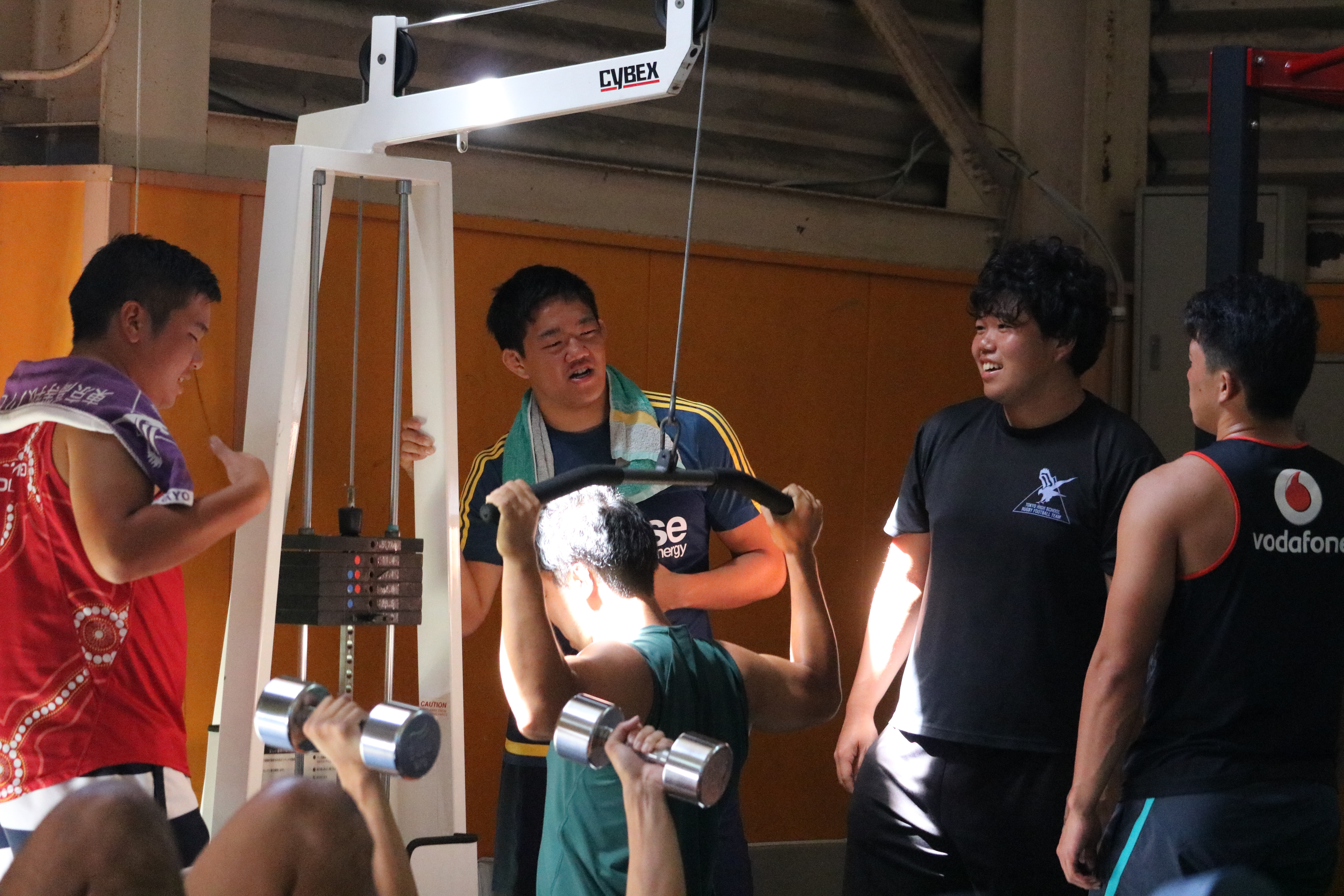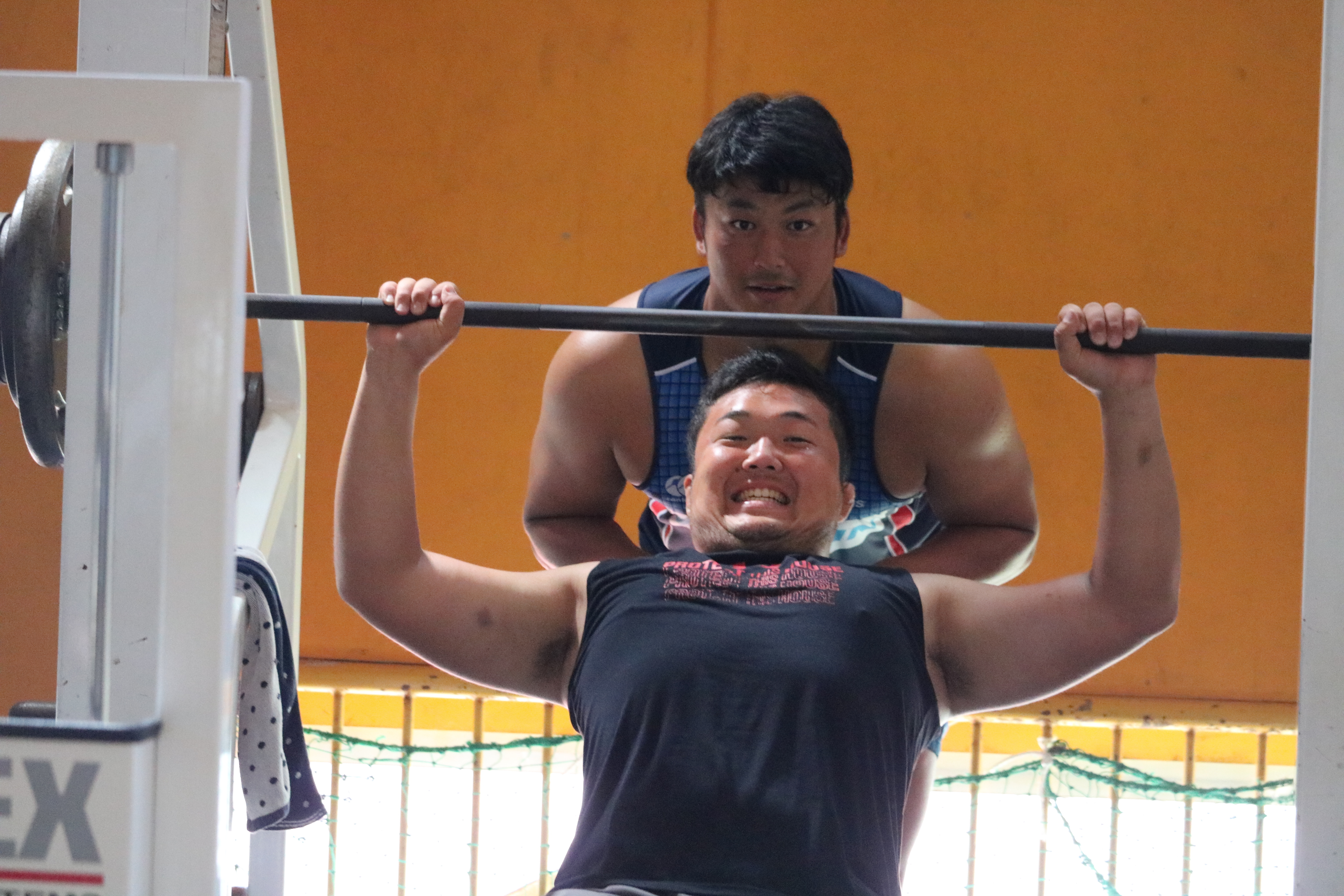 朝食後、部員たちは宿舎内のウエイト場でトレーニングを行いました。