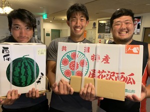 暑い練習を乗り越えた後のスイカに部員みんな大喜びです。
