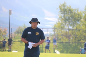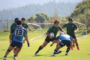 「平素より青山学院大学ラグビー部をご覧いただきありがとうございます。今日のBチームの試合では、体の大きい相手に対して、前に出て体を貼るディフェンスができたと思います。対抗戦でもこの粘り強いディフェンスでいい結果に繋げたいと思います。今後ともご支援、ご声援のほどよろしくお願いします。」